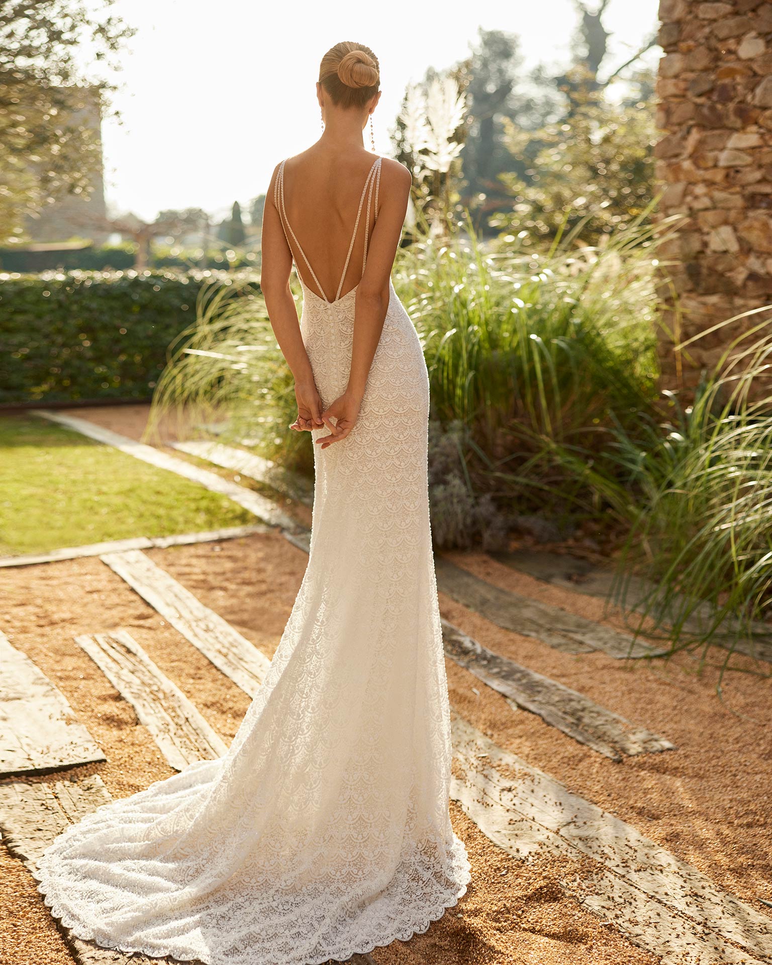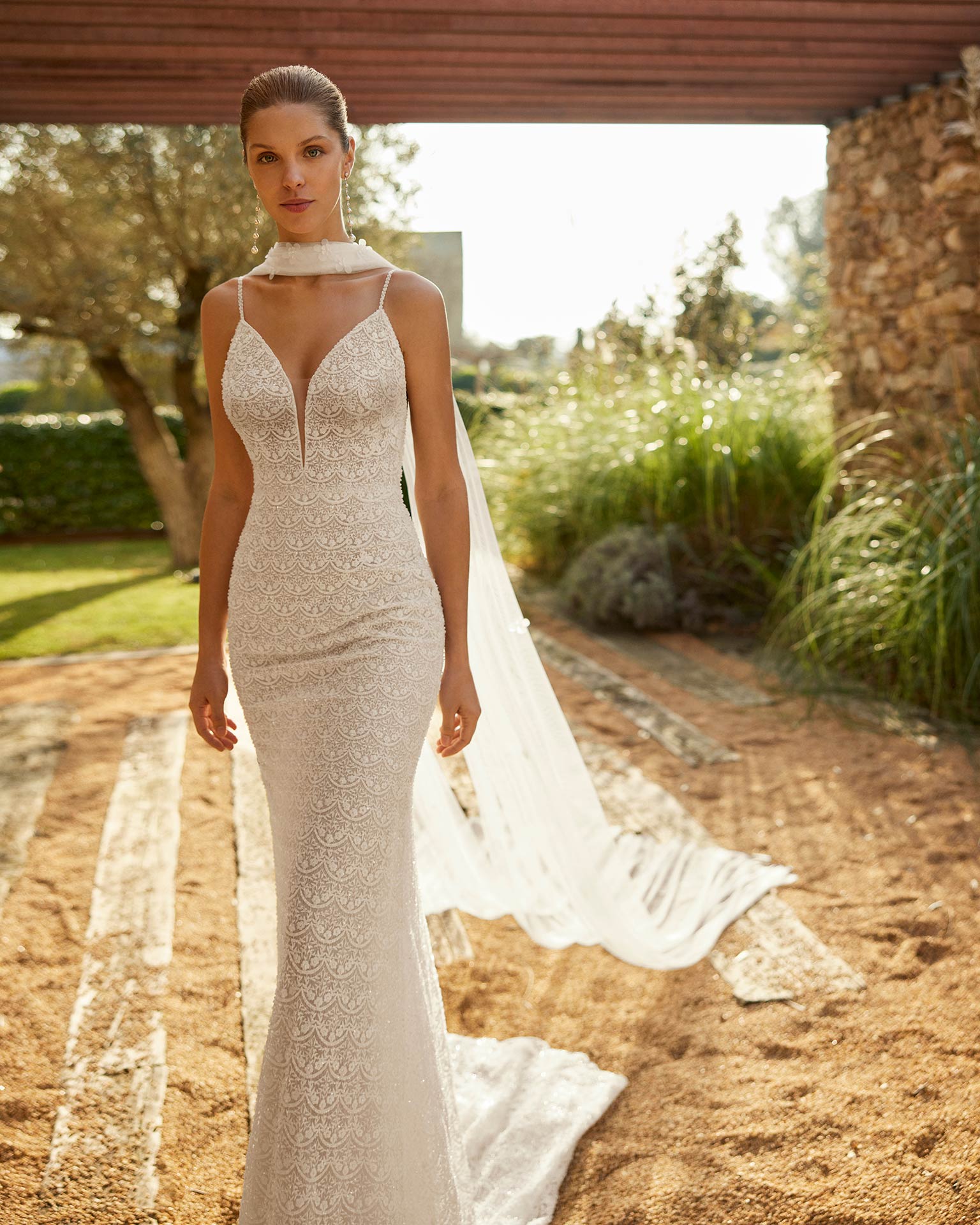Svatební šaty Zuri v rovném střihu jsou ztělesněním elegance a smyslnosti. Jemná krajka zdobená korálky tvoří základ tohoto modelu, který je doplněn hlubokým výstřihem a tenkými ramínky posázenými perličkami. Otevřená záda působí odvážně a vzdušná vlečka dodává šatům lehkost i výjimečný charakter. Ideální pro nevěstu, která hledá moderní a sofistikovaný styl s nádechem originality.