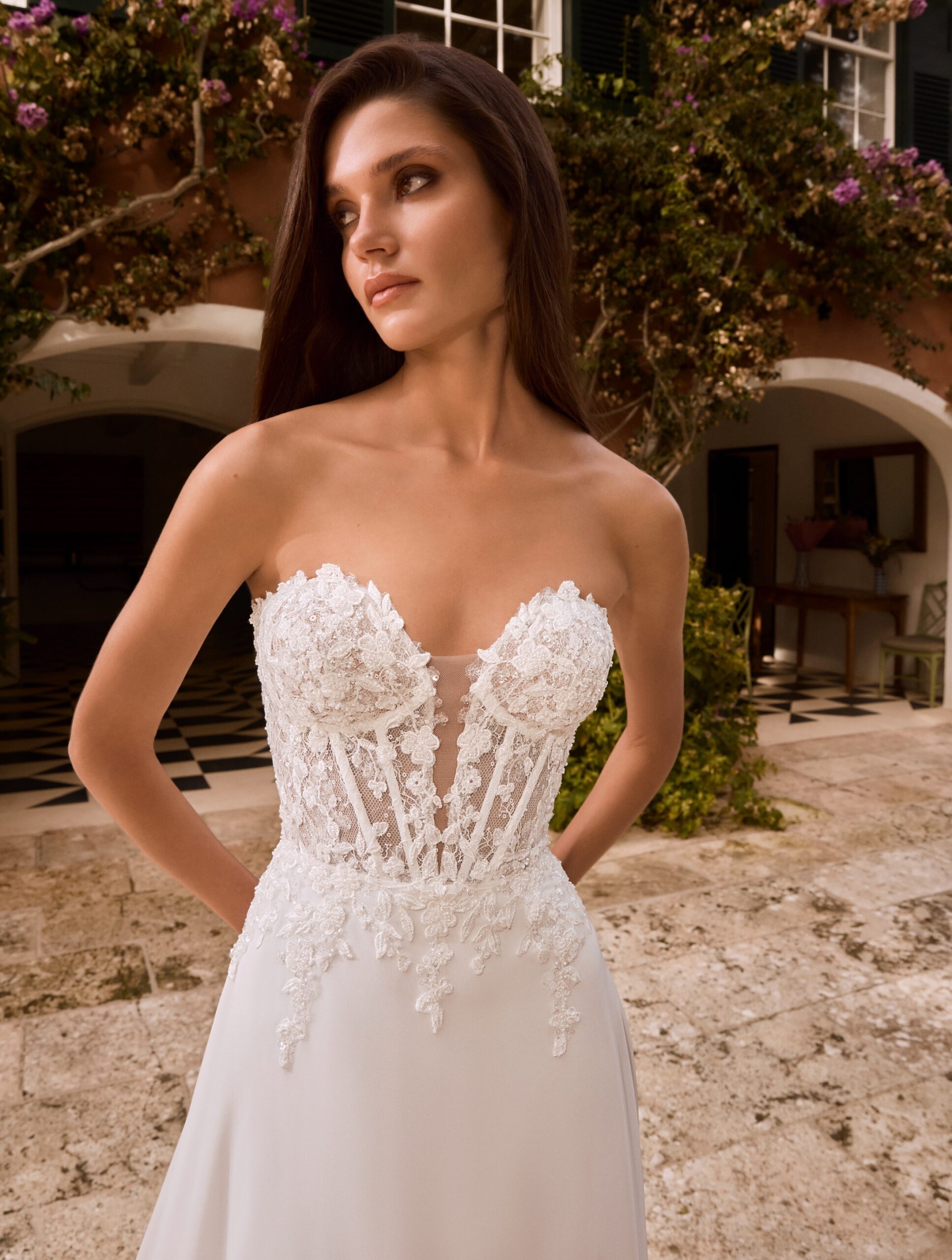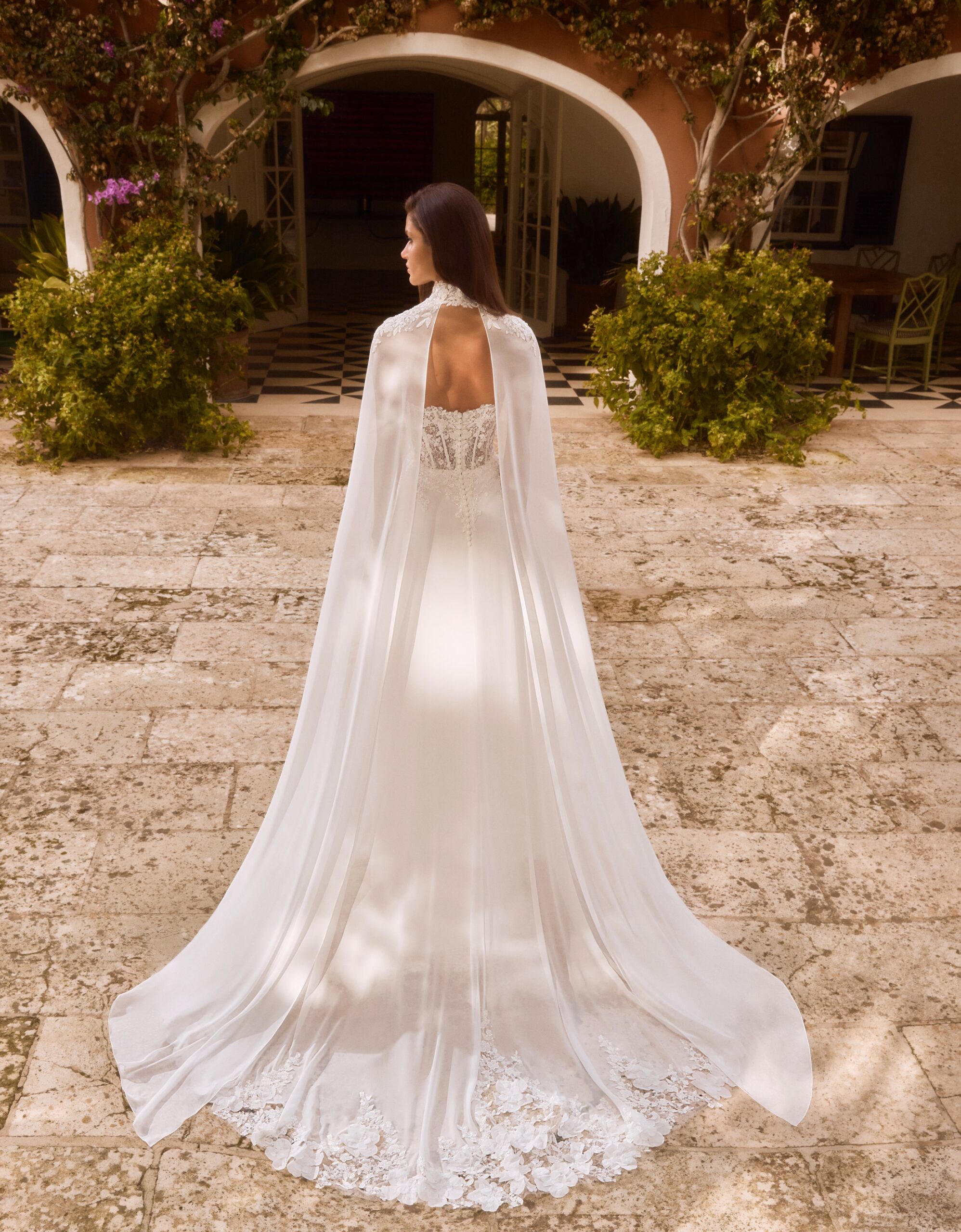 Svatební šaty Annie od Alberto Palatchi v romantickém střihu A-linie kombinují sofistikovanou eleganci s výraznými detaily. Korzetový živůtek je zdobený jemnými krajkovými aplikacemi a korálky, zatímco lehká hedvábná šifonová sukně s krajkovou vlečkou dodává šatům noblesní a vzdušný vzhled. Součástí modelu je odnímatelný plášť s vysokým krajkovým límcem, který umožňuje vytvořit dramatický a elegantní look. Ideální volba pro nevěstu hledající romantickou, nadčasovou a sofistikovanou svatební eleganci.