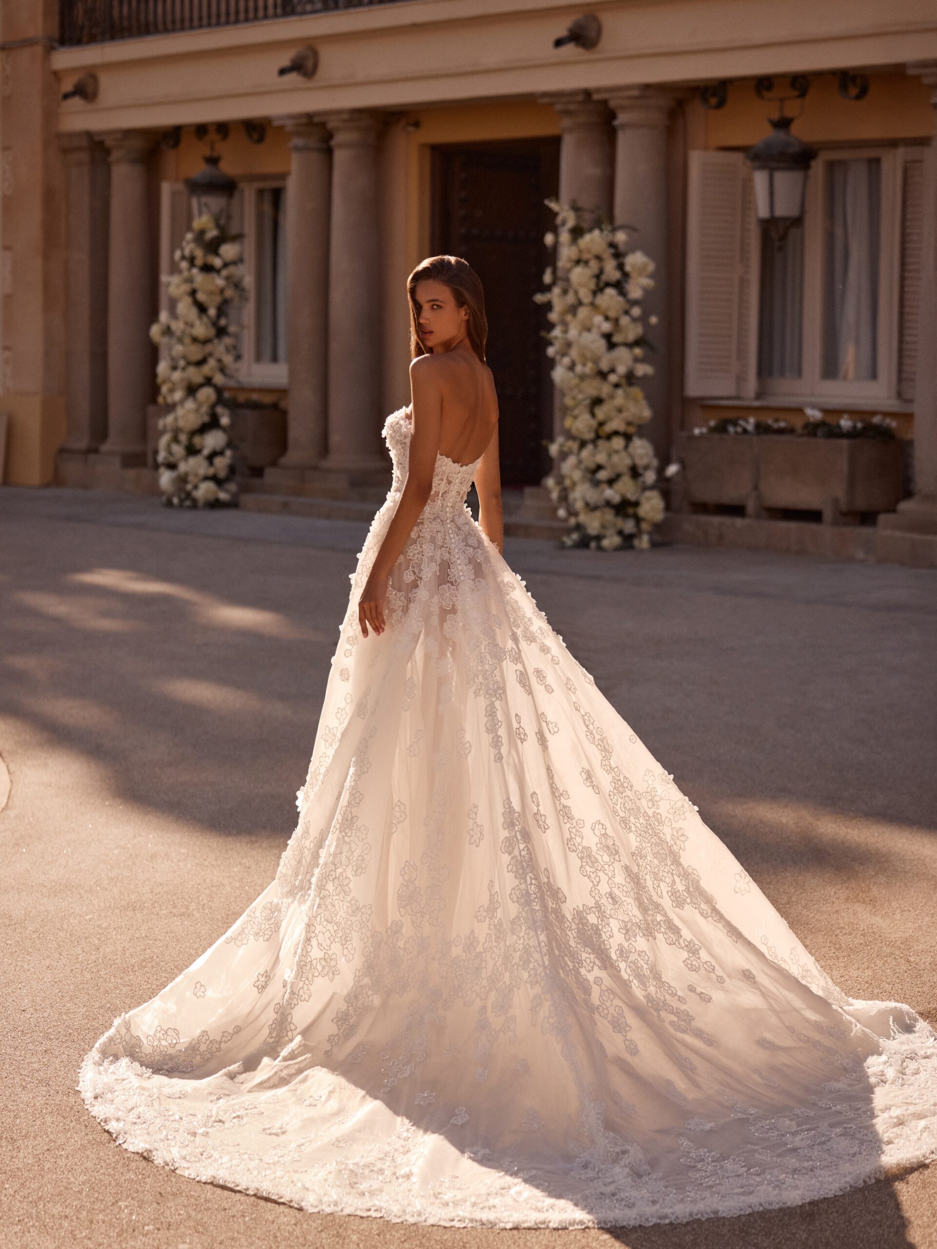 Talia Couture patří ke svatebním šatům té nejvyšší krejčoviny. Kombinují romantiku a moderní elegance v nadčasovém střihu A-linie. Ručně vyšívaný korzetový živůtek s lodičkovým výstřihem je kompletně zdoben jemnými krajkovými aplikacemi a 3D květinami, které vytvářejí průhledný, sofistikovaný efekt. Sukně elegantně splývá a vytváří jemnou a vzdušnou siluetu, která podtrhuje ženskou postavu. Ideální volba pro nevěstu, která hledá moderní a romantický svatební look s originálními detaily.