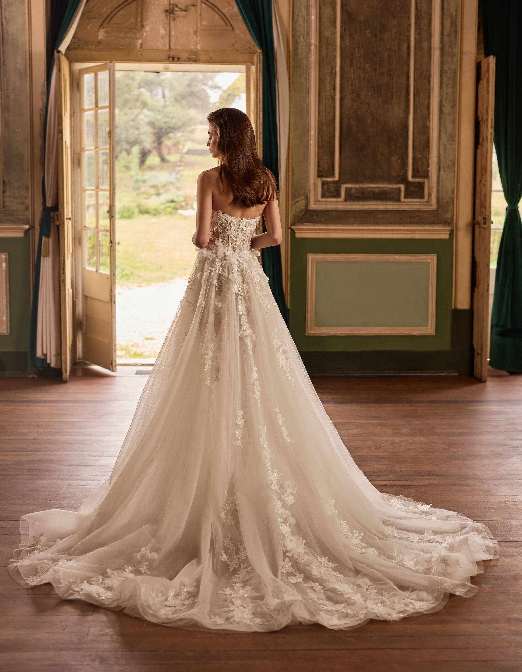 Svatební šaty Heidi od Alberto Palatchi v romantickém střihu A-linie spojují sofistikovanou eleganci s moderními detaily. Strukturovaný korzetový živůtek je zdoben jemnými krajkovými aplikacemi a 3D květinami, které dodávají šatům výrazný a originální detail. Lehce splývavá tylová sukně je doplněna rozparkem na noze, který podtrhuje ladnou siluetu a přináší sofistikovanou smyslnost. Ideální volba pro nevěstu, která hledá romantický a současně výrazný svatební look.