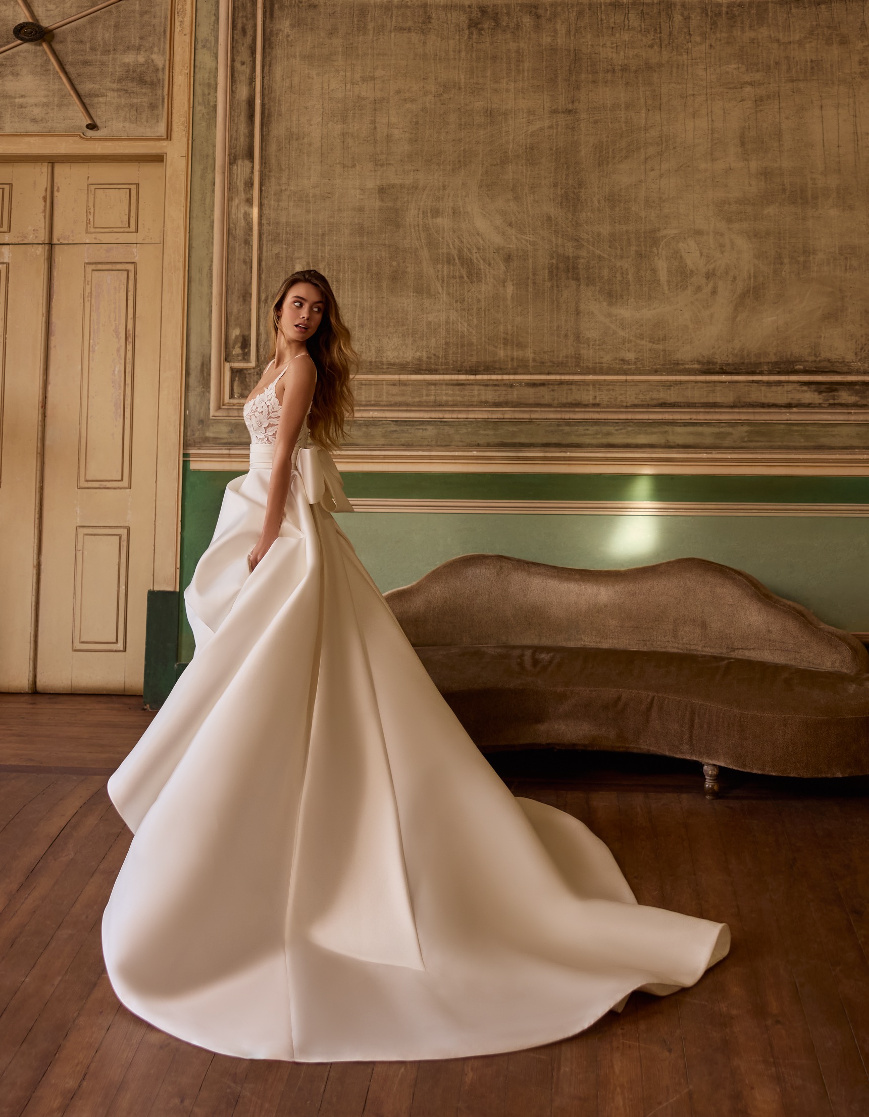 Svatební šaty Romee od Alberto Palatchi kombinují romantiku a moderní princeznovský styl. Živůtek je zdoben jemnými krajkovými aplikacemi a má hranatý výstřih, který dodává šatům elegantní nádech. Objemná sukně z mikada vytváří majestátní a sofistikovanou siluetu. Model je doplněn o odnímatelnou mikado mašli na zádech, která umožňuje variabilní styling a přidává šatům hravý a moderní detail. Ideální volba pro nevěstu, která hledá romantický, nadčasový a výrazný svatební look.