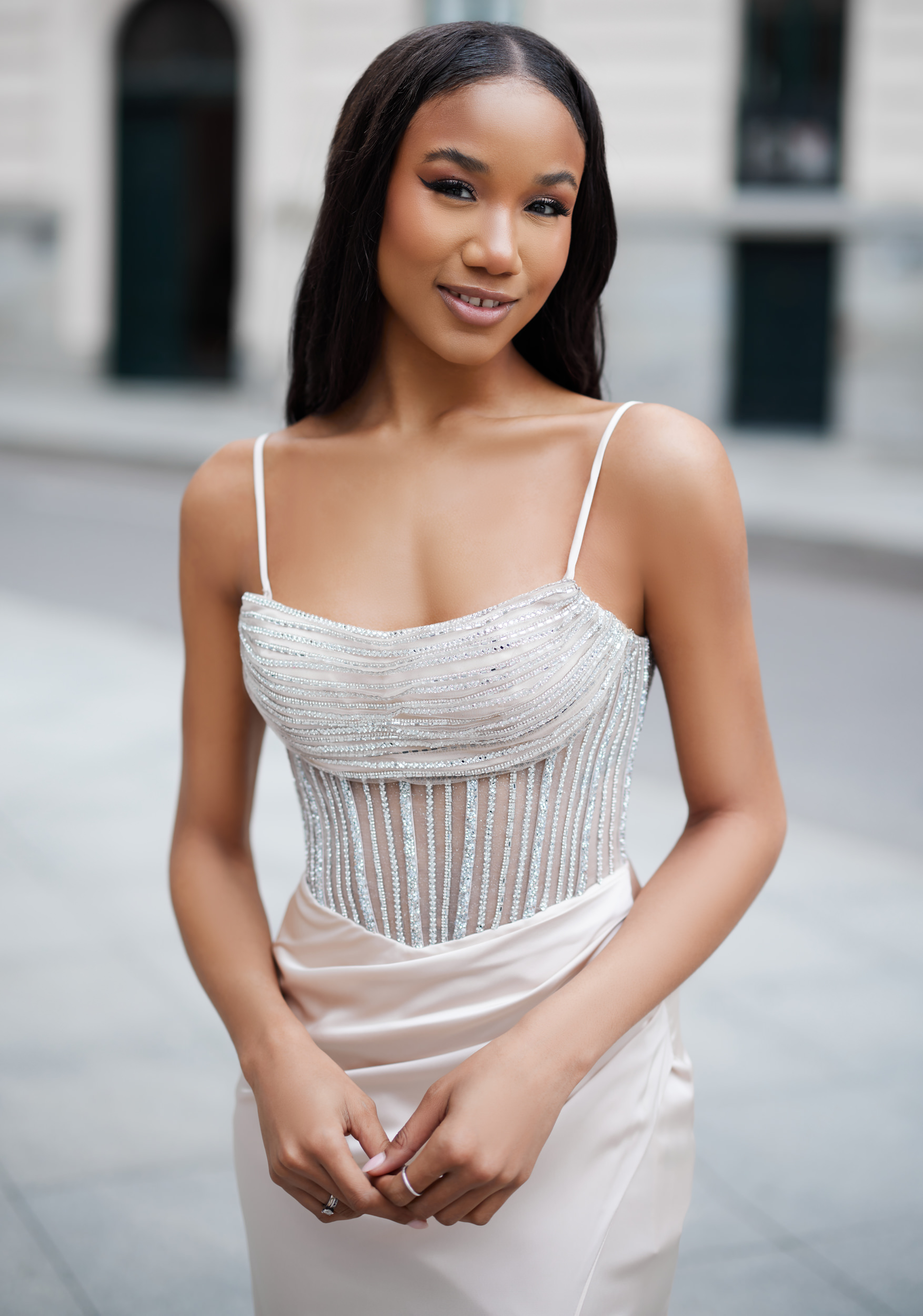 Společenské šaty Christian Koehlert 1079 v šampaňském odstínu a elegantním, přiléhavým střihem. Korzetový živůtek na tenkých ramínkách je zdoben jemnými třpytivými proužky a výšivkou, které opticky prodlužují siluetu a zvýrazňují dekolt i pas. Hladká splývavá sukně je doplněna vysokým rozparkem, jenž dodává šatům lehkost a smyslnost při chůzi. Celkový vzhled působí velmi sofistikovaně, luxusně a zároveň jemně. Ideální volba pro plesy, galavečery, slavnostní večery i výjimečné společenské události.