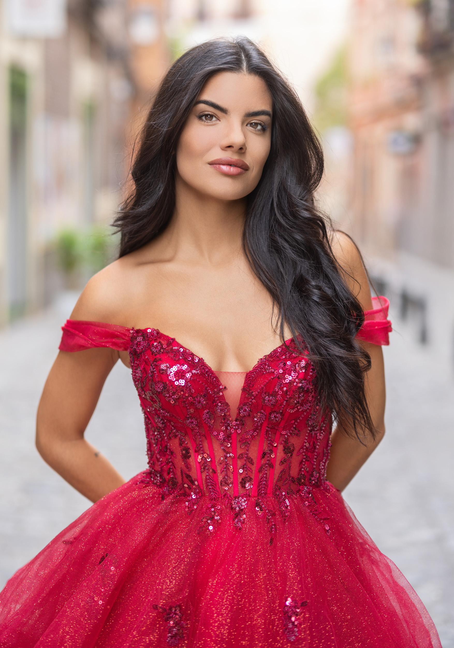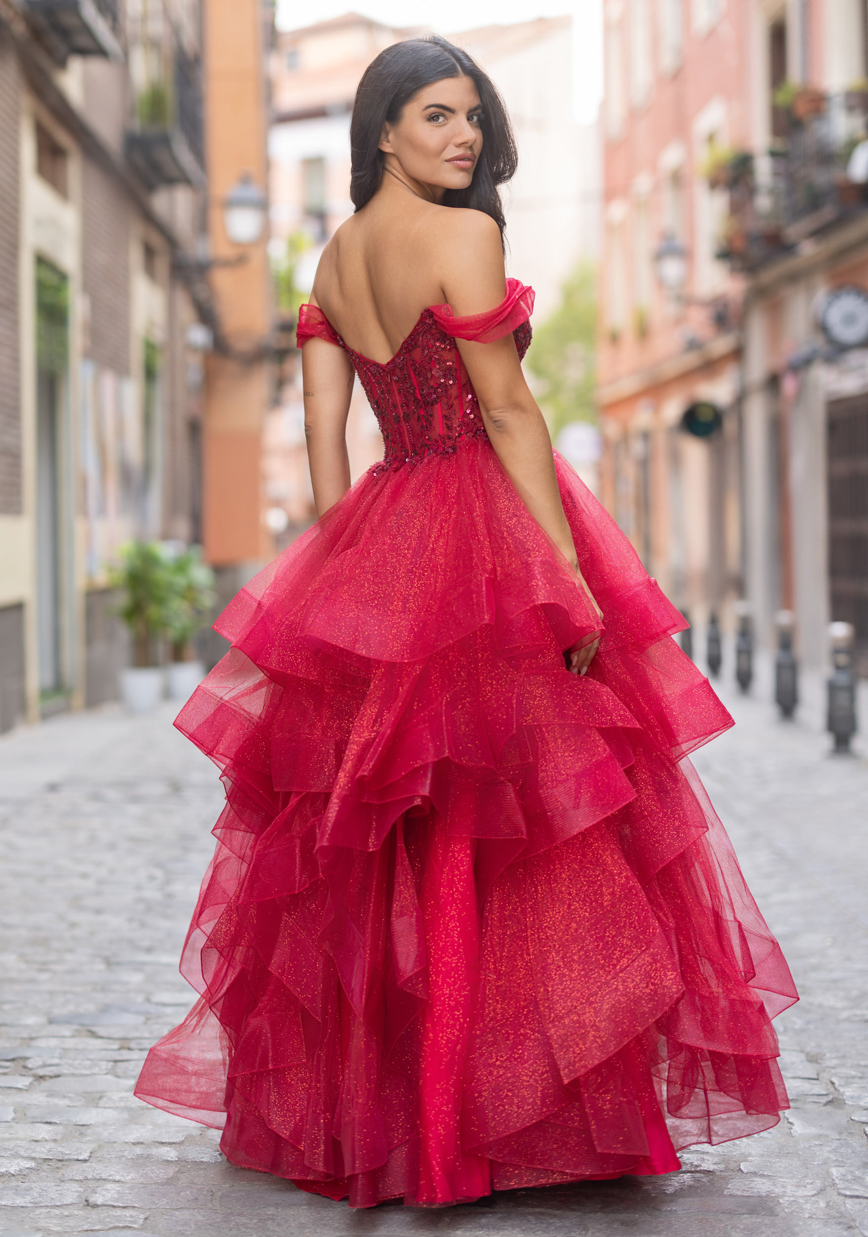 Společenské šaty model 1102 od značky Christian Koehlert je výrazná večerní róba v sytě červeném odstínu s jemným třpytivým efektem. Korzetový živůtek je bohatě zdoben krajkou a aplikacemi, které opticky tvarují pas a zvýrazňují dekolt. Odhalená ramena s jemnými spadlými rukávky dodávají šatům ženskost a smyslnost. Vícevrstvá tylová sukně vytváří objem a lehkost při chůzi, zatímco celkový střih působí velmi noblesně a slavnostně. Ideální volba pro plesy, galavečery nebo výrazné společenské události. Tento model v nabídce i v páví zelené barvě.