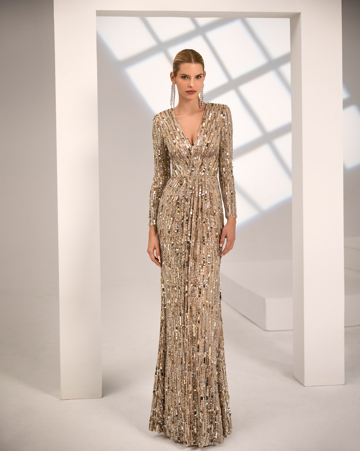 Společenské šaty 1J2K7 od značky Marfil Barcelona představují nadčasovou eleganci v moderním večerním provedení. Model je vytvořen z luxusní zdobené látky s jemným třpytivým efektem, který dodává šatům slavnostní a sofistikovaný vzhled.