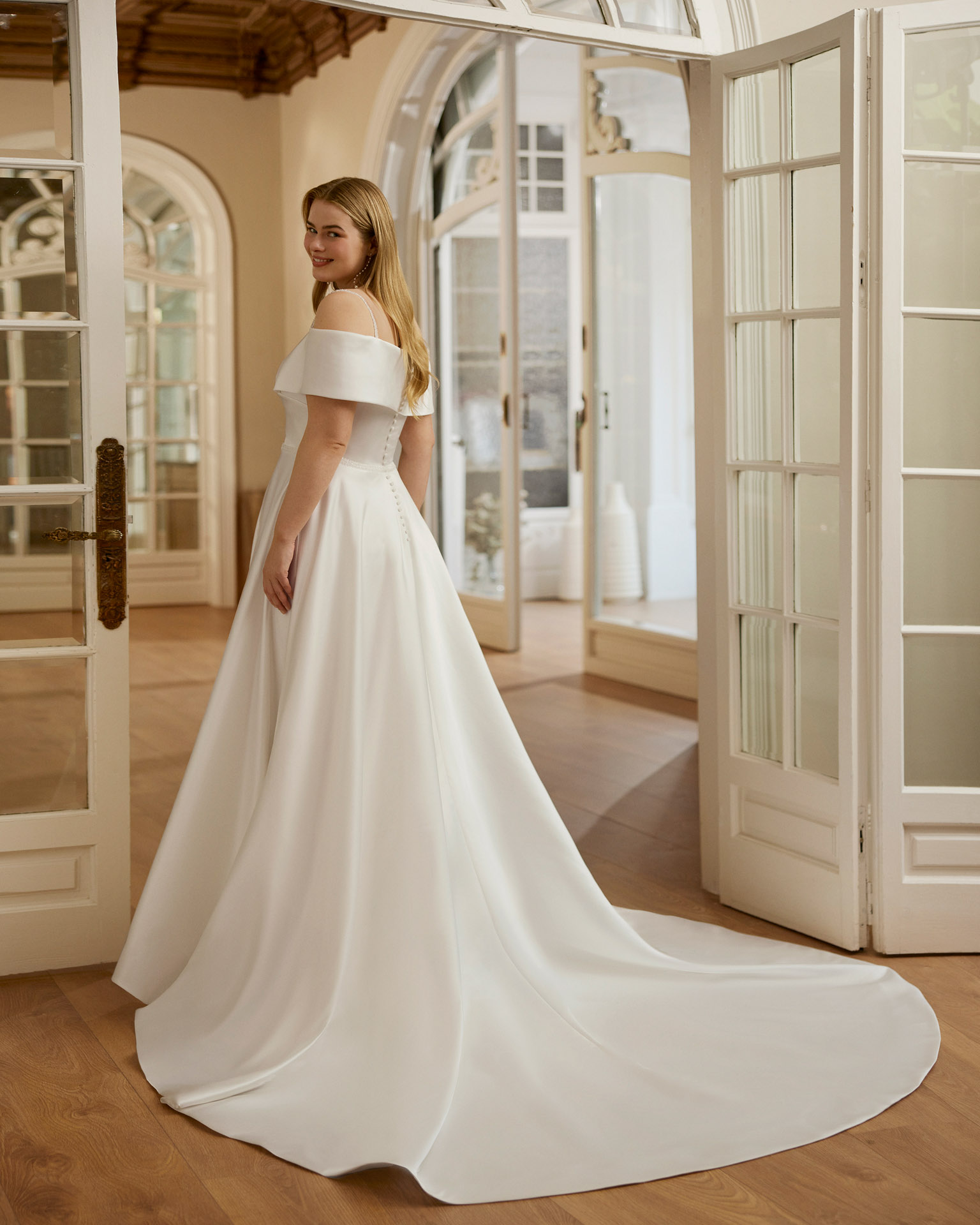 Svatební šaty Wisela od Martha Blanc v áčkovém střihu spojují nadčasovou eleganci s jemnou smyslností. Bardot výstřih krásně zvýrazňuje ramena a dekolt, zatímco lehká sukně s bočním rozparkem dodává modelu vzdušnost a moderní nádech. Tyto šaty jsou ideální volbou pro nevěstu, která hledá romantický, ale zároveň sebevědomý look s jemným nádechem smyslnosti.
