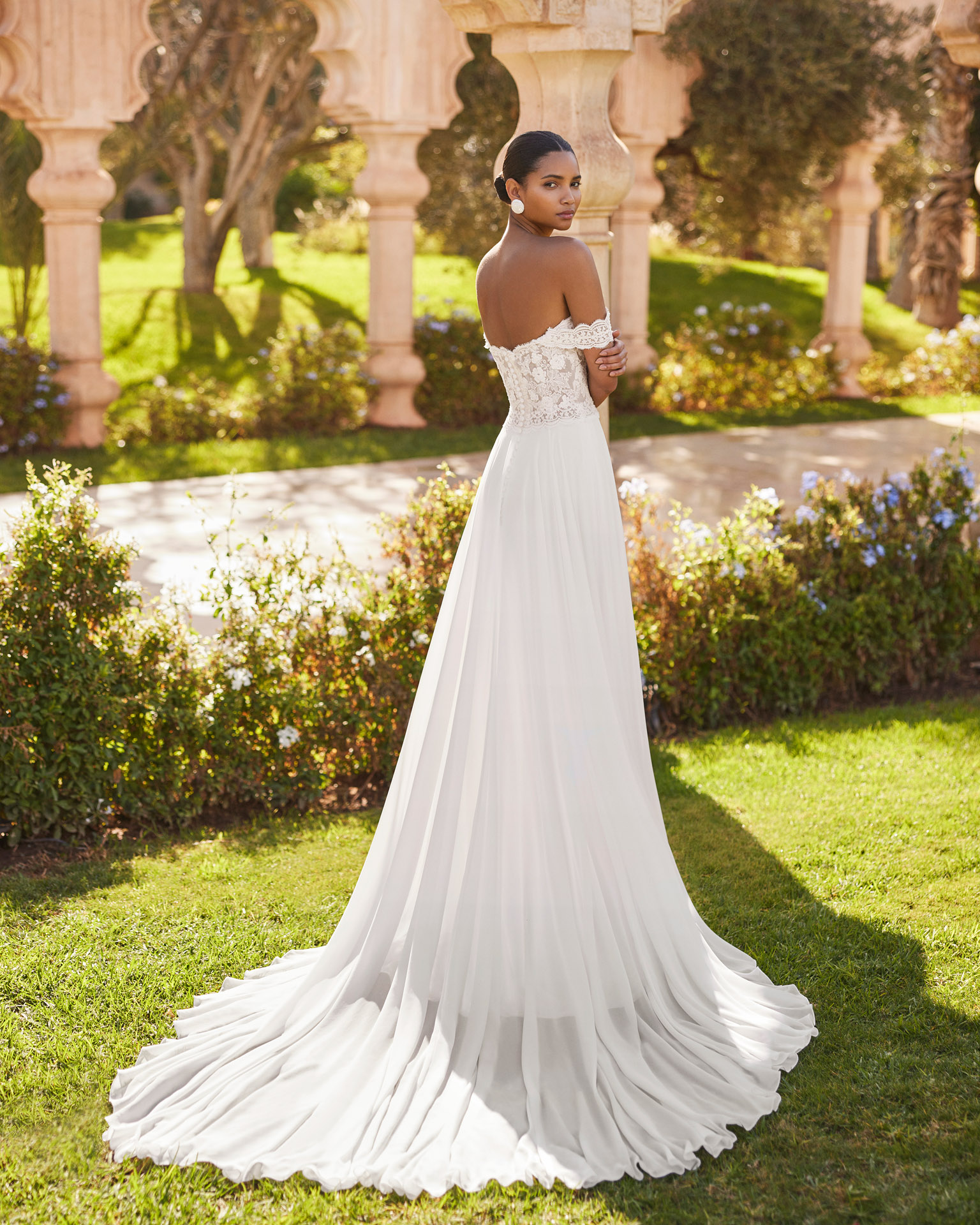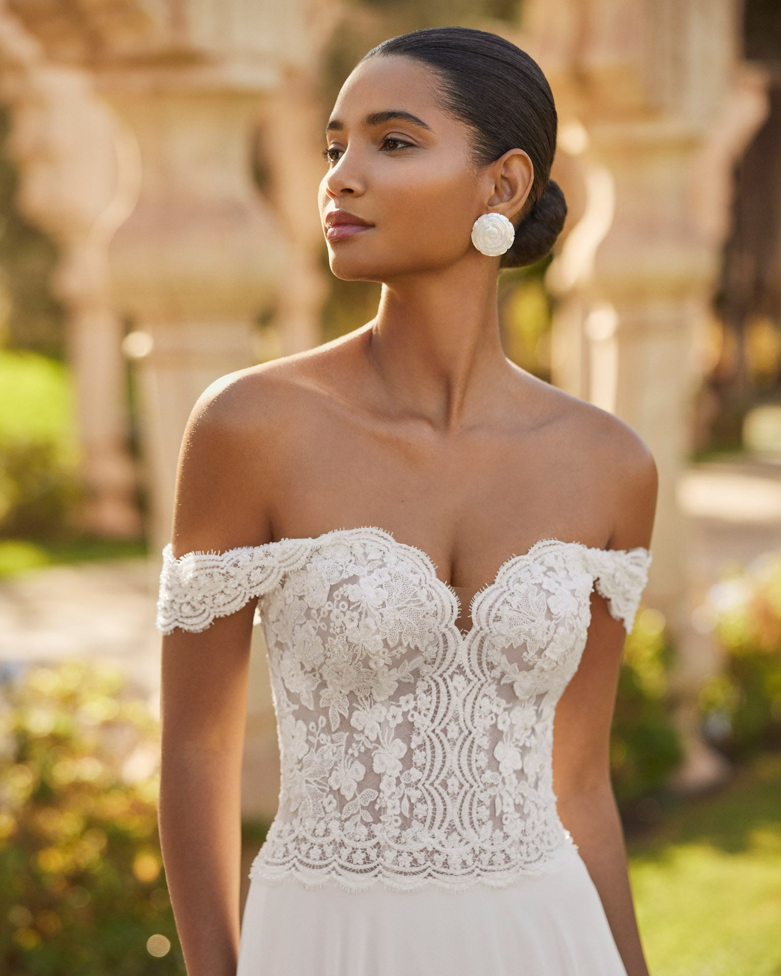 Romantické svatební šaty Obice s elegantním rovným střihem, které působí lehce a přirozeně. Sukně je ušita z jemného žoržetu, zatímco živůtek je zdobený krajkou a korálky. Srdíčkový výstřih podtrhuje ženskost a odnímatelná ramínka dávají nevěstě možnost volby mezi klasickým a moderně odhaleným vzhledem. Ideální pro nevěsty, které hledají nadčasovou eleganci s jemnými detaily.