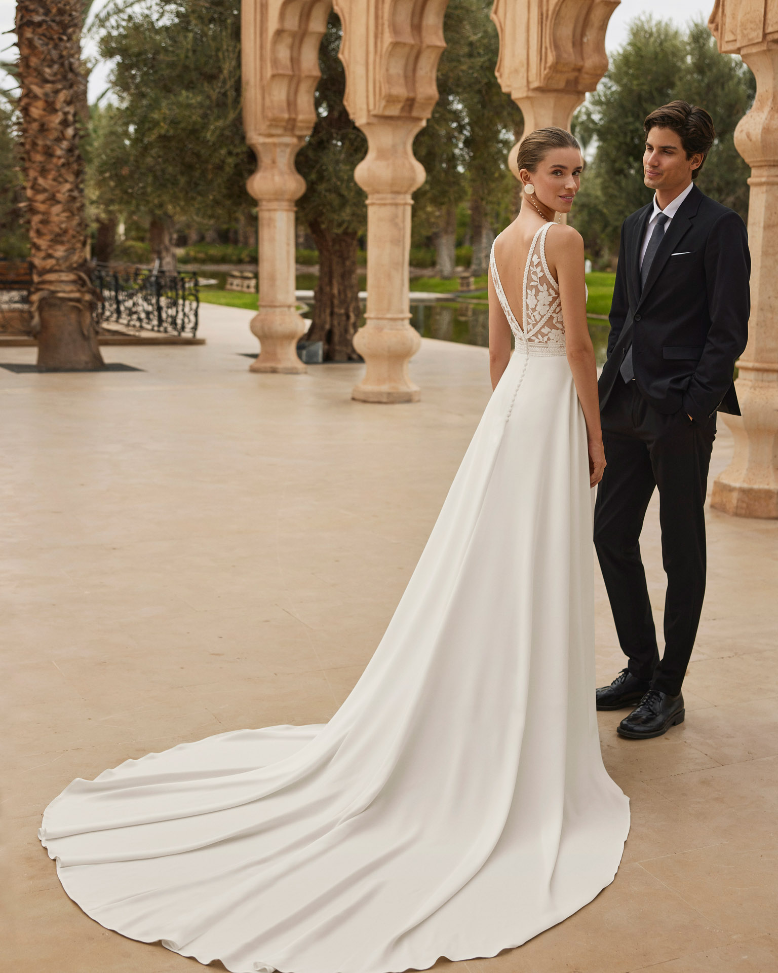 Svatební šaty Ocal značky Rosa Clará v lichotivém střihu A-linie spojují moderní eleganci a smyslnost. Sukně z elastického krepu je navržena s decentním rozparkem na straně, který dodává šatům lehkost a šmrnc. Živůtek z jemné krajky s korálky zdůrazňuje ženskou siluetu díky hlubokému výstřihu a elegantnímu V-čkovému dekoltu na zádech. Ideální volba pro nevěstu, která hledá kombinaci nadčasového stylu a moderních detailů.