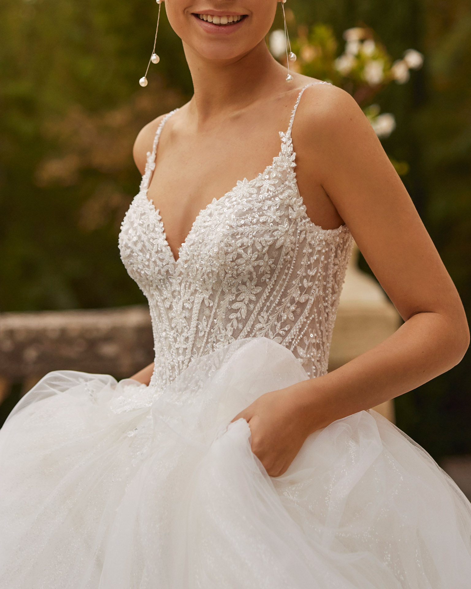 Svatební šaty Venuz od značky Rosa Clará okouzlí svou princeznovskou siluetou a romantickými detaily. Sukně z lehkého tylu je doplněna krajkovým živůtkem zdobeným jemnými korálky. Srdíčkový výstřih a ramínka zvýrazňují dekolt, zatímco otevřená záda dodávají šatům smyslný a elegantní nádech. Tyto šaty jsou ideální volbou pro nevěstu, která touží po nadčasové, romantické a sofistikované svatební eleganci.