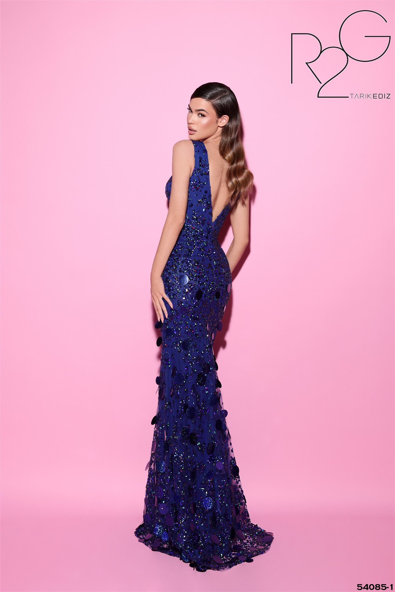 Dominantním prvkem je hluboký véčkový výstřih doplněný transparentním tylem, jenž dodává modelu smyslný, ale stále sofistikovaný vzhled. Celý povrch šatů je bohatě zdoben třpytivými flitry a aplikacemi, které vytvářejí efektní lesk při každém pohybu. Královsky modrá barva podtrhuje noblesu a nadčasovou eleganci modelu.