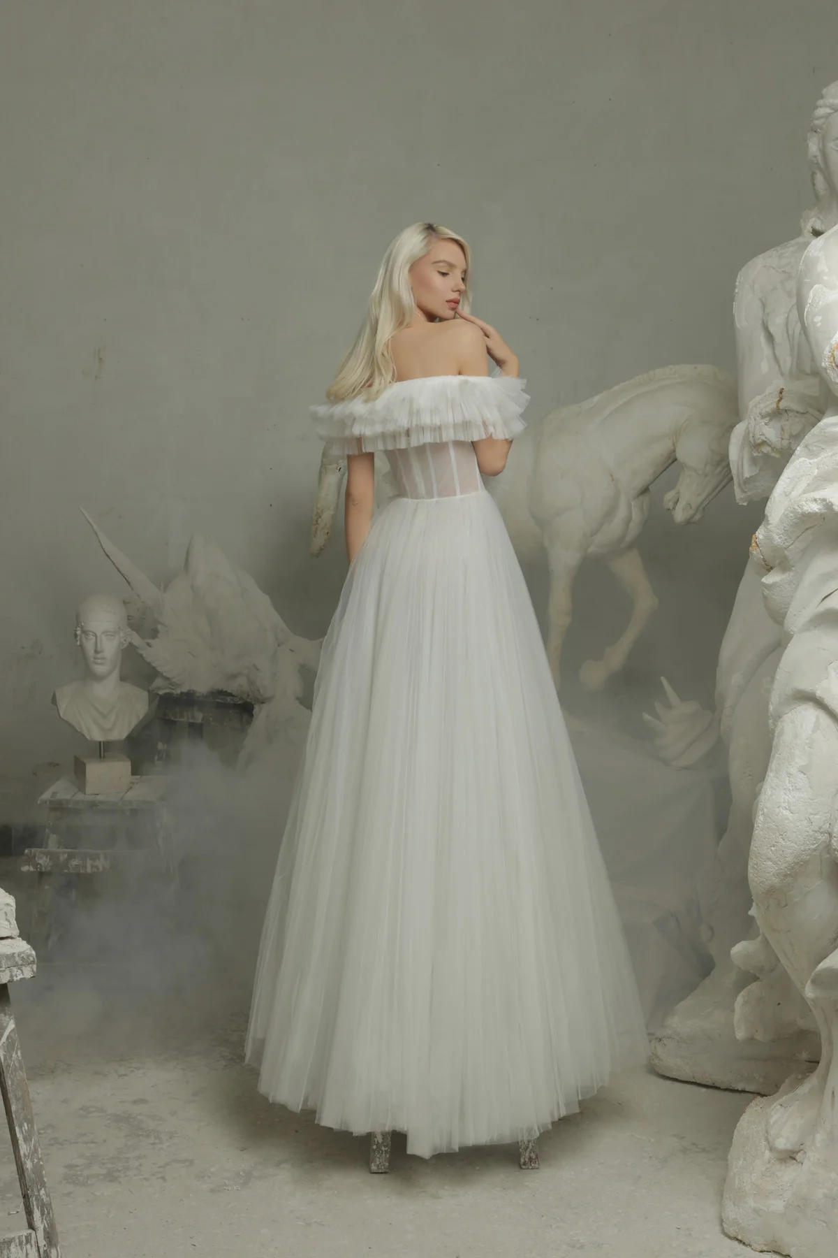 Asymetrický střih odhalující nohu dodává modelu moderní dynamiku, zatímco splývavá tylová sukně přecházející do prodloužené vlečky působí lehce a vzdušně. Odhalená ramena zvýrazňují linii dekoltu a podtrhují ženskost celého modelu.