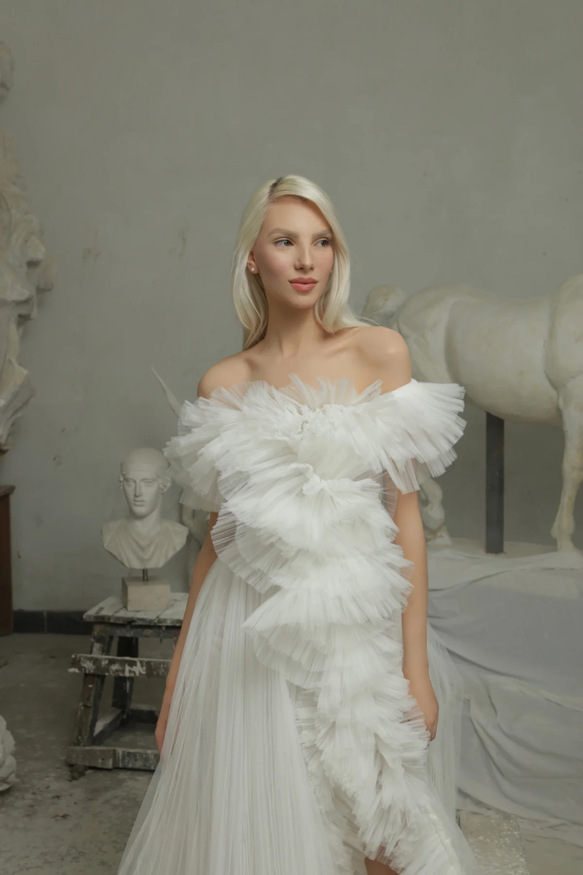 Svatení i společenské šaty Patrice od Tarik Ediz představují výjimečný couture model, který zaujme svou originalitou a výrazným designem. Šaty v elegantní bílé barvě zdobí bohaté vrstvené tylové volány, které vytvářejí dramatický a zároveň romantický efekt.
