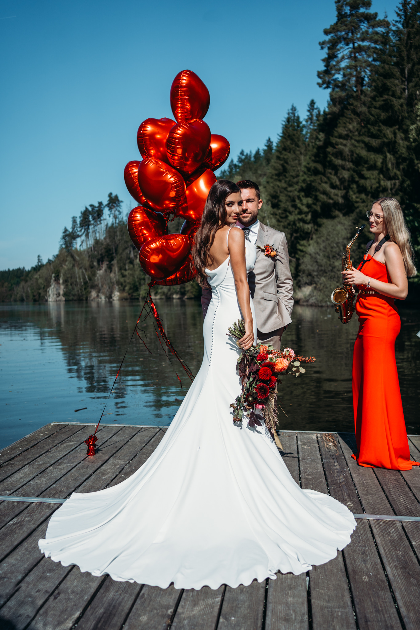 Hlavní barvou editorialu byla červená a zlatá doplněná o zelenou. Koncept byl daný, vymyslela ho Klárka, Jihočeská nevěsta. Na nás bylo postarat se a obléknout nevěstu se ženichem a saxofonistkou. Nevěsta vystřídala dva krásné modely svatebních šatů – Antiope a Lauretta. Ženicha jsme oblékli do krásného zlatavého obleku od Wilvorst. Saxofonistka měla na sobě šaty v barvě editorialu, červené.